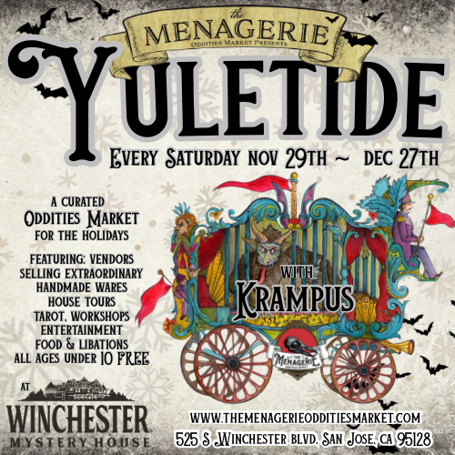 Join us on the following weekends at the world-famous Winchester Mystery House --- I'll be joining the Menagerie Oddities Market for my fourth holiday season with their fabulously creepy YULETIDE residency!