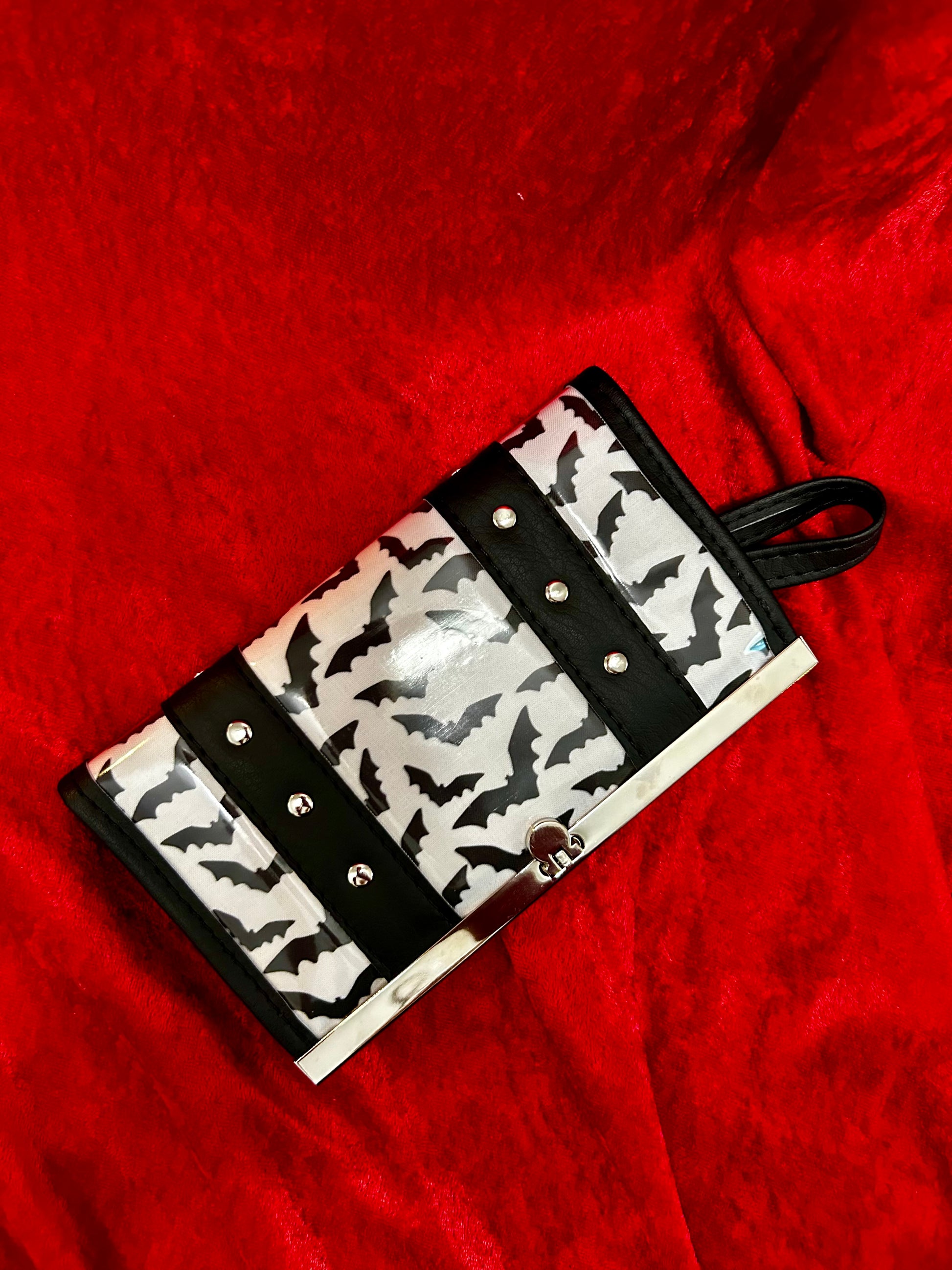 Keep your ghoulish goods safe and stylish with the Batty Betty wallet! This bi-fold wallet is made of a gothic-inspired white fabric with flying black bats, and a rich matte vegan leather. Feel secure knowing all your goodies are tucked away with a framed clasp closure, inner zipper pocket, six inner card slots and two inner slip pockets. Make a statement with a vampire-worthy accessory – perfect for the Diabla 66 purse!
