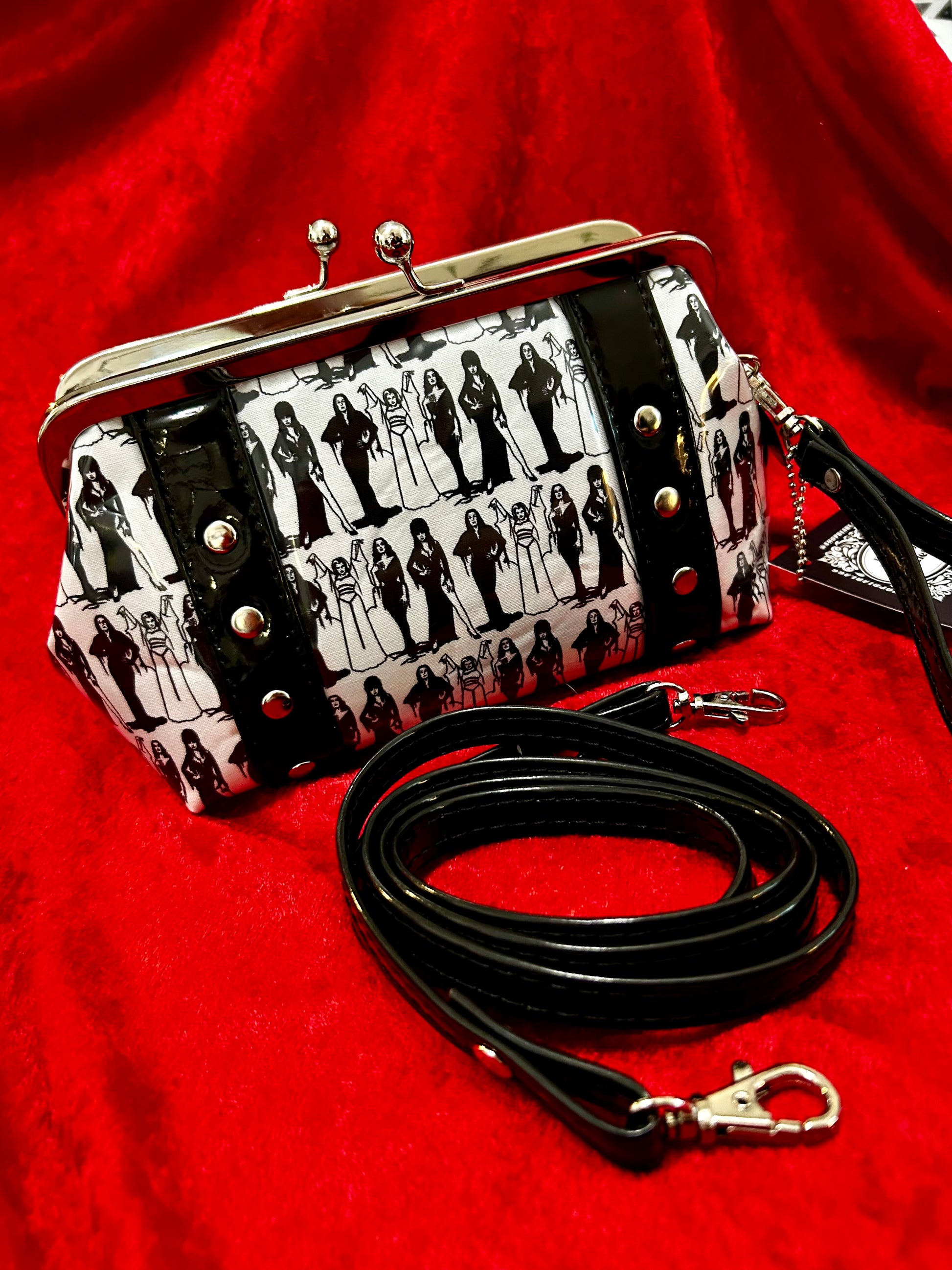 The ultimate goth girl accessory is here -- the Ghoul Gang clutch bag! The included detachable crossbody strap makes it the perfect accessory for horror honeys who love hands-free versatility. This spook-tacular sidekick has it all: white fabric with four legendary ghoul bosses, glossy black faux leather, silver-toned hardware and a detachable wrist strap to keep your ghoulish glamour on-the-go! Plus, with an 8 inch kisslock frame, inner zipper pocket and clear vinyl overlay, it's as tough as it is stylish. So, up your ghoulish glamour rock your own tribute to the ladies of horror with this statement piece.