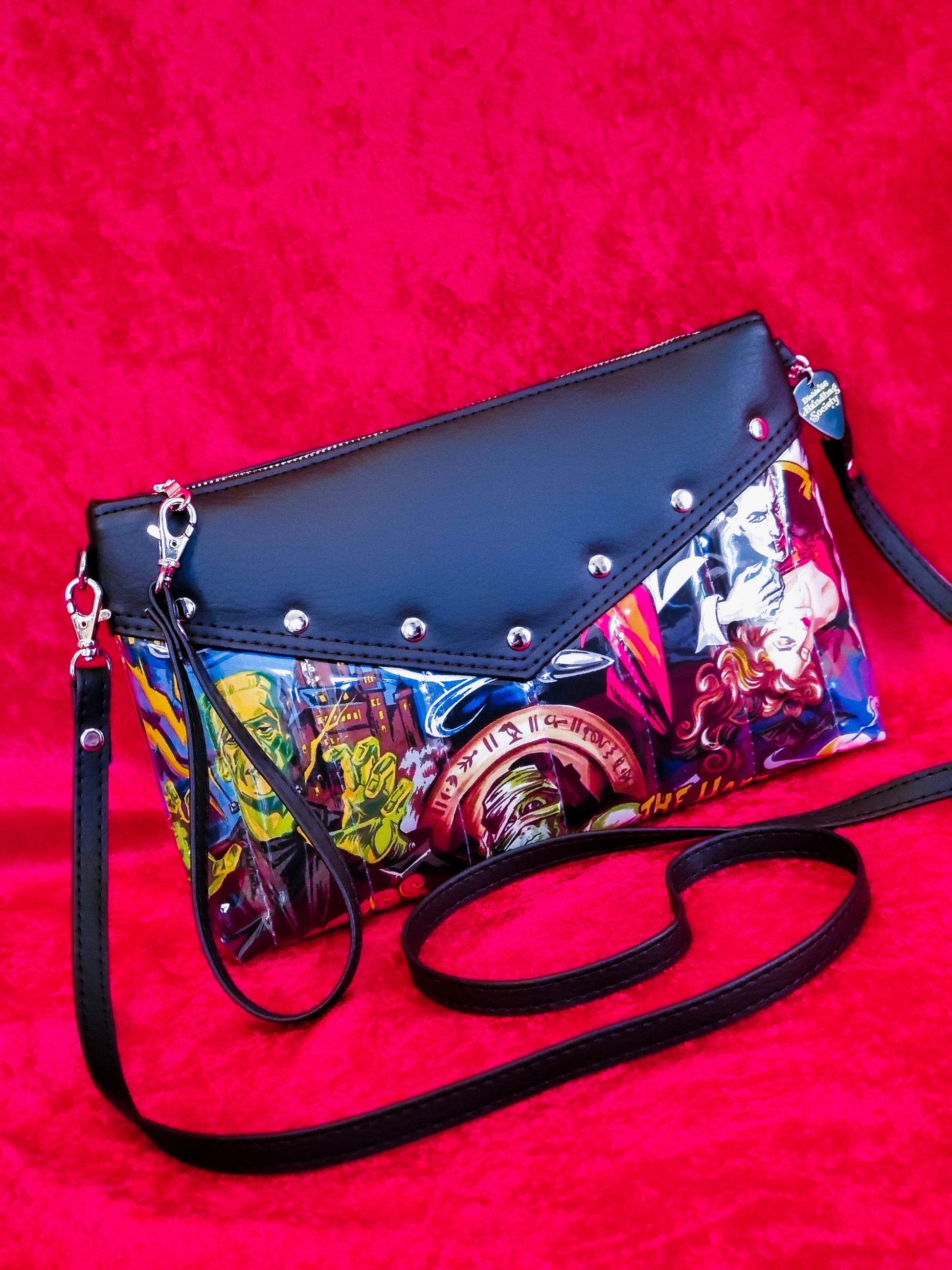 Are you ready to add a monstrously stylish accessory to your wardrobe? The Midnight Monster Movie Crossbody is the perfect way to show off your spooky style! Its zipper closure and inside pocket keep your valuables safe and sound, while the detachable crossbody and wrist straps let you carry it however you like. Plus, the clear vinyl overlay protects it and makes it easy to keep clean. Make a killer impression during Halloween season and beyond with this frightfully stylish and functional purse.