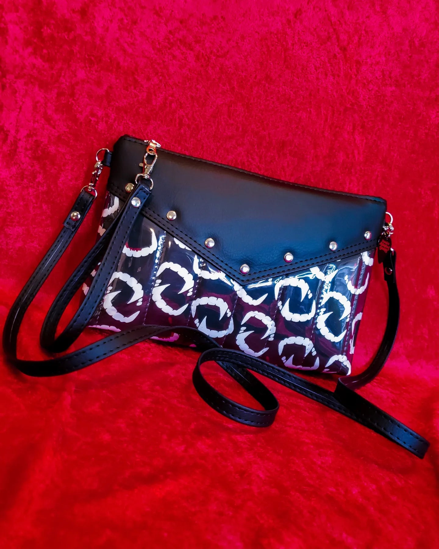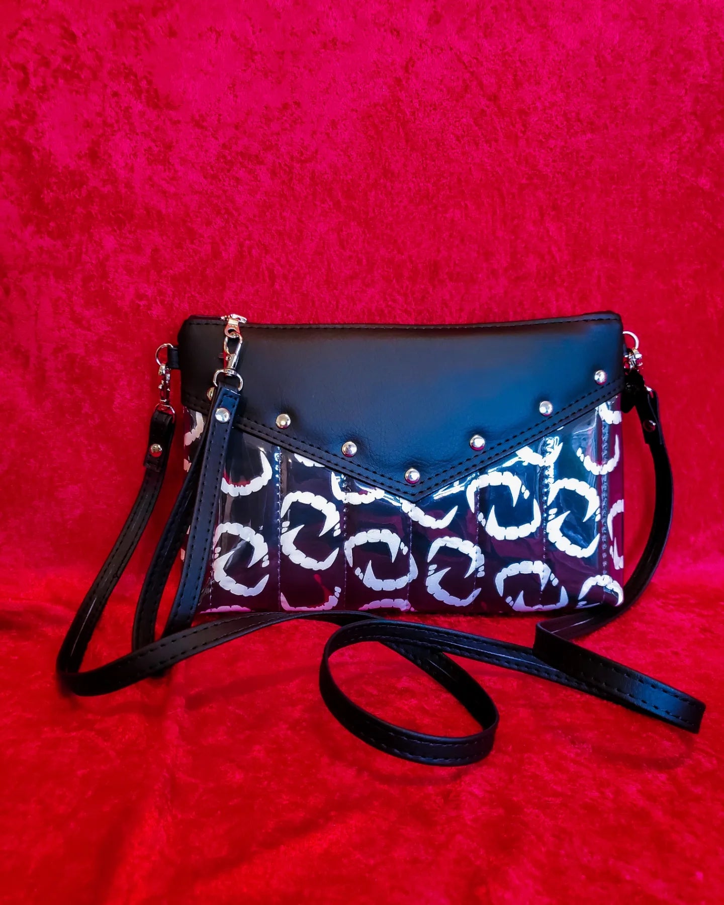 Let your personal style be as monstrously unique as you are with this Fangtastic Crossbody! Vampy fang imagery in black and white paired with rich onyx vegan leather trim make this retro-style crossbody a timeless accessory, leveling up your carry-all companion from Halloween to ANYTIME. Its metal zipper closure offers extra security while the detachable crossbody and wrist straps provide extra versatility. So, unleash your inner-vamp and show the world your one-of-a-kind style!