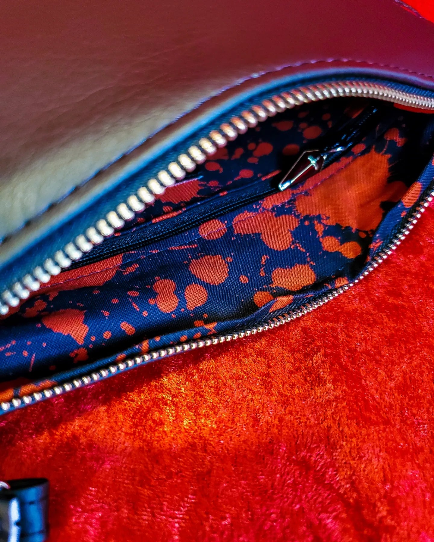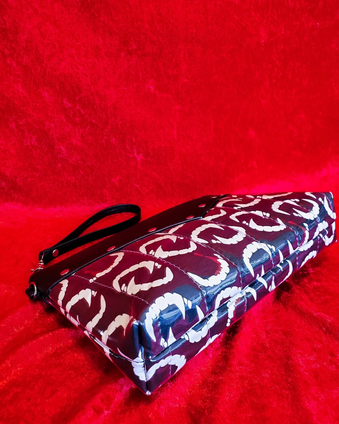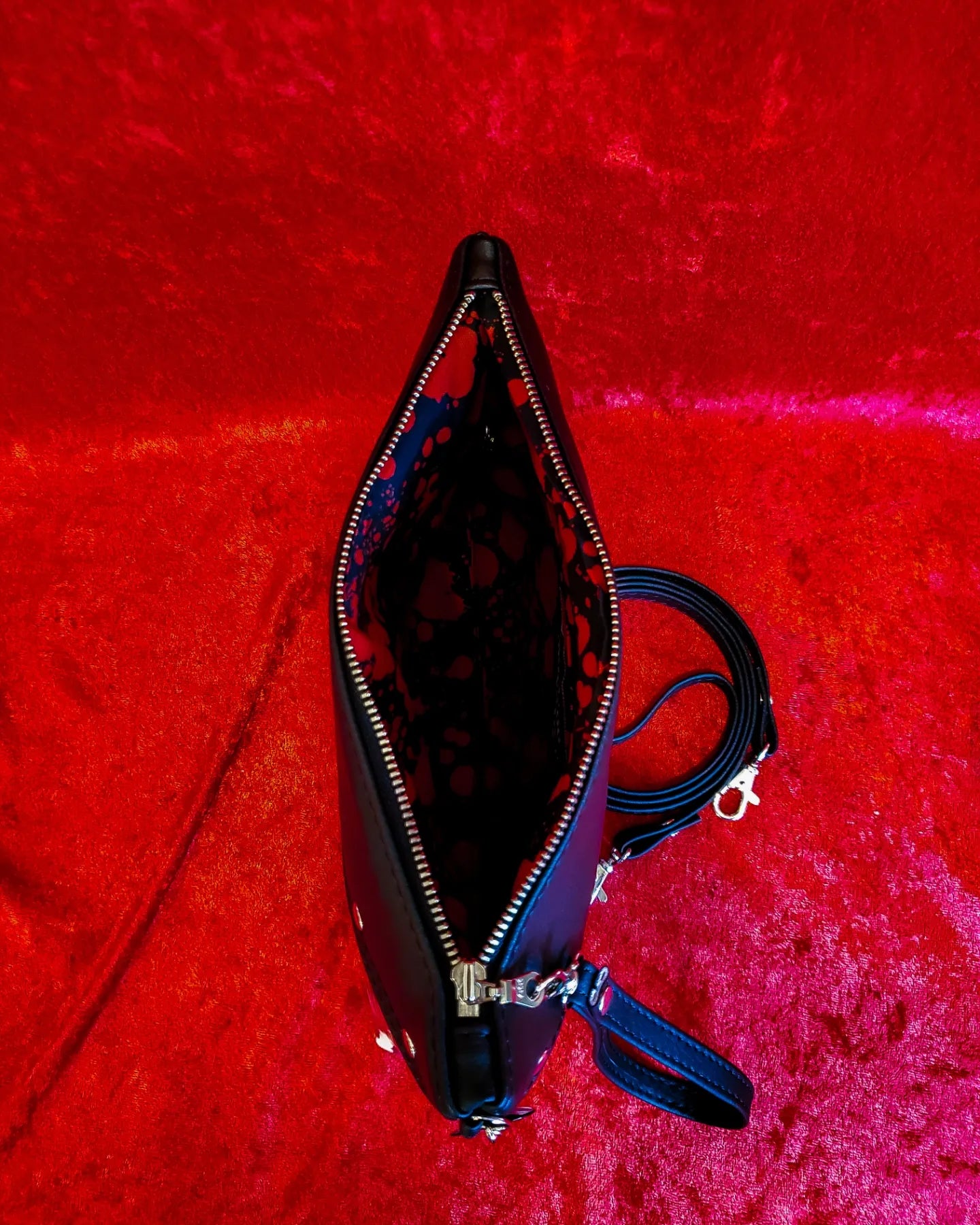 ***Features a limited edition black blood splatter lining (as supply lasts) — once it's gone, the interior will be replaced with a coordinating solid red lining to make those bloody fangs really pop!