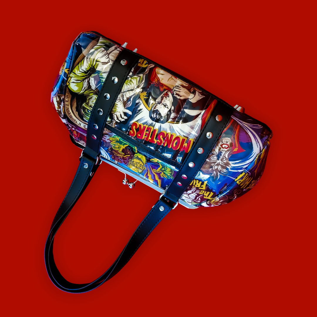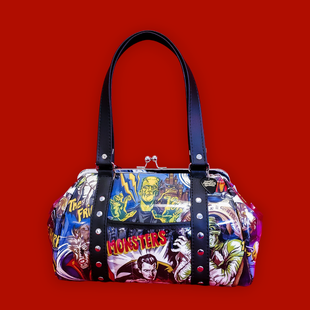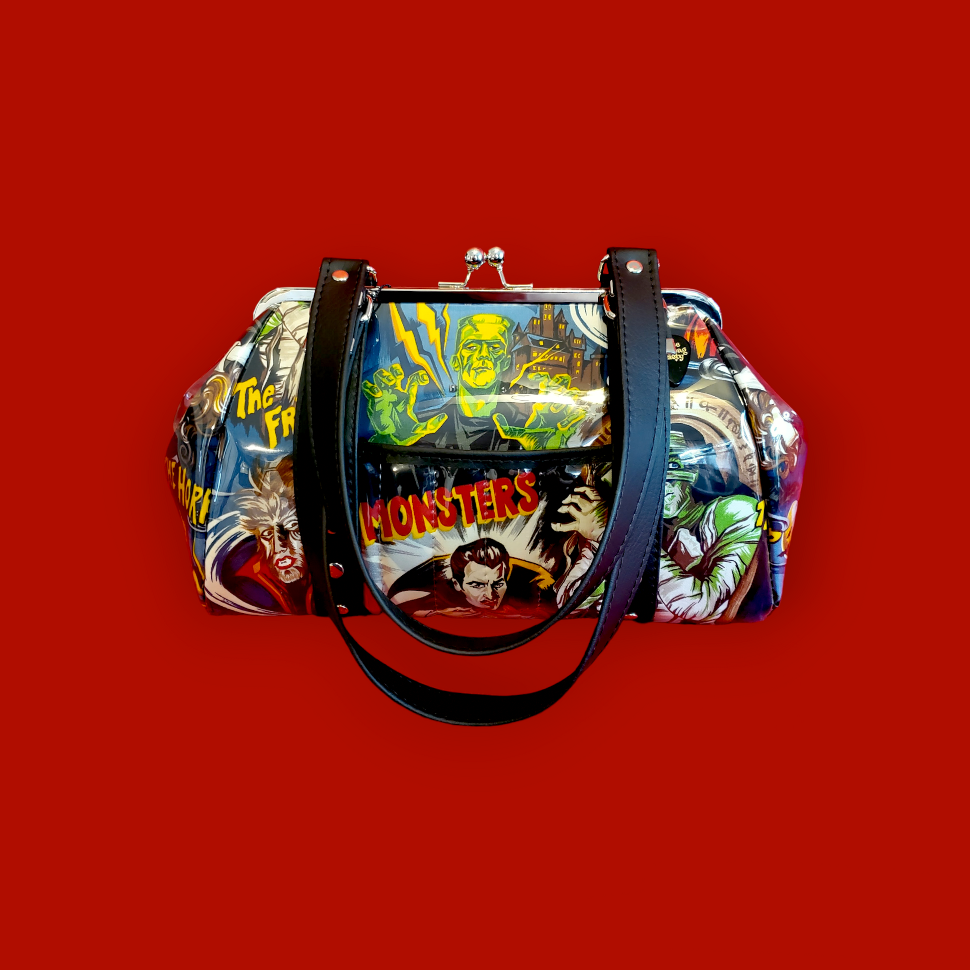 Be the envy of the daring and fashionable with the Midnight Monster Movie Handbag. She's the perfect package of spooky sophistication, with her brightly colored, hunky-monster prints and matte black vegan leather – she’s a fierce accesssory for any modern maven of terror. Swish through the night in style with her double shoulder straps for extra comfort and convenience. Let the monster movies begin!