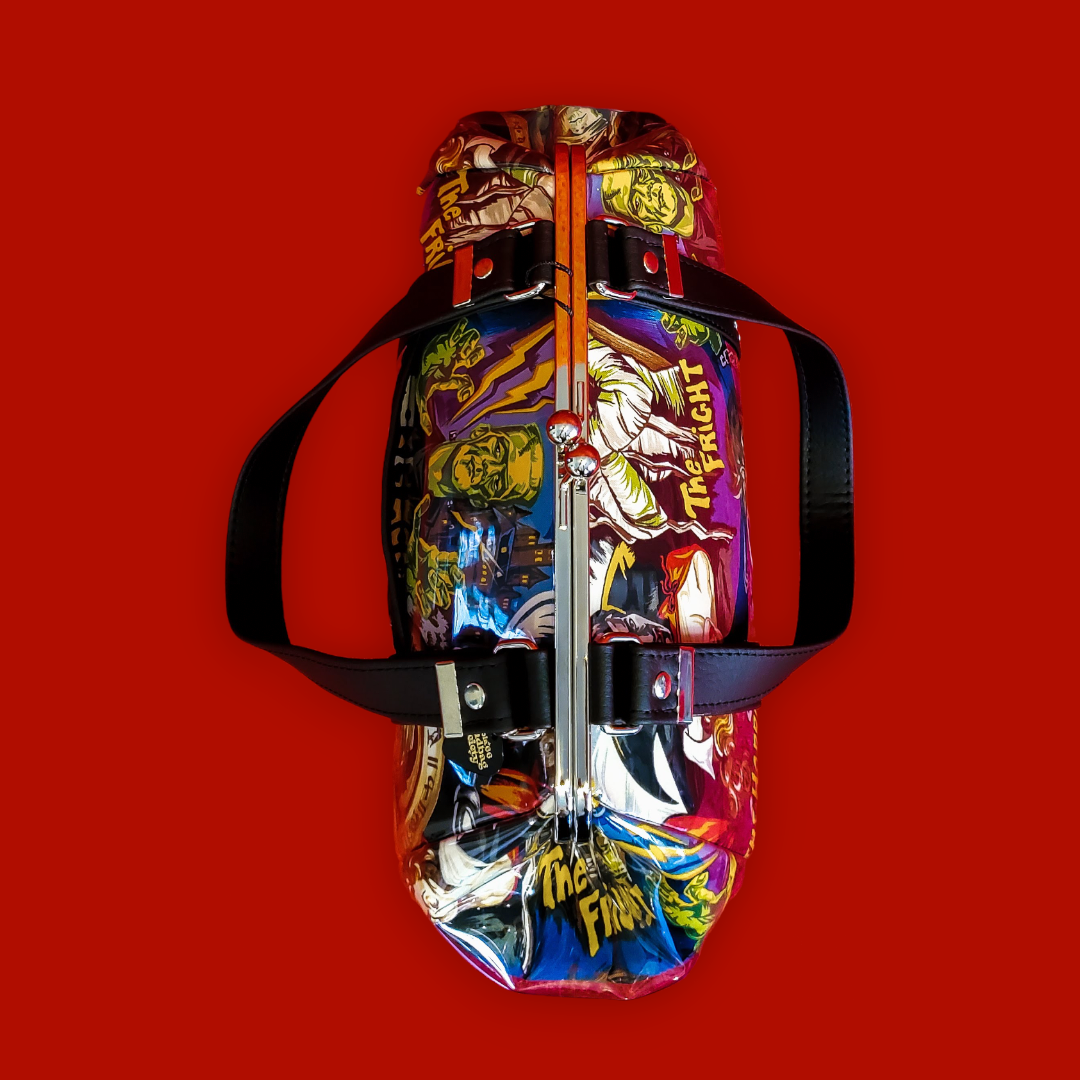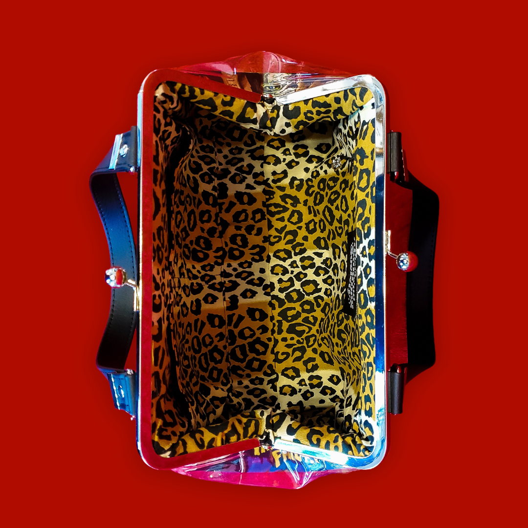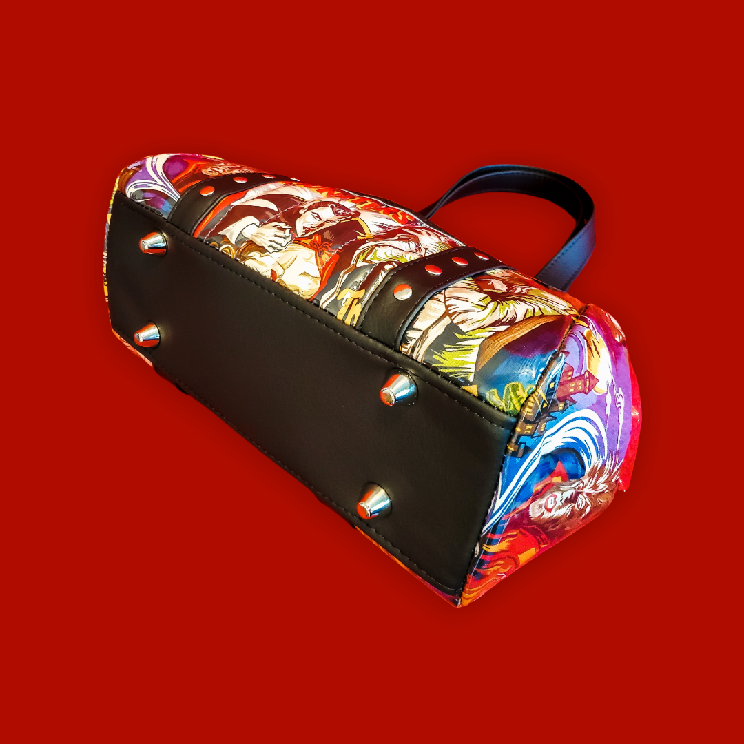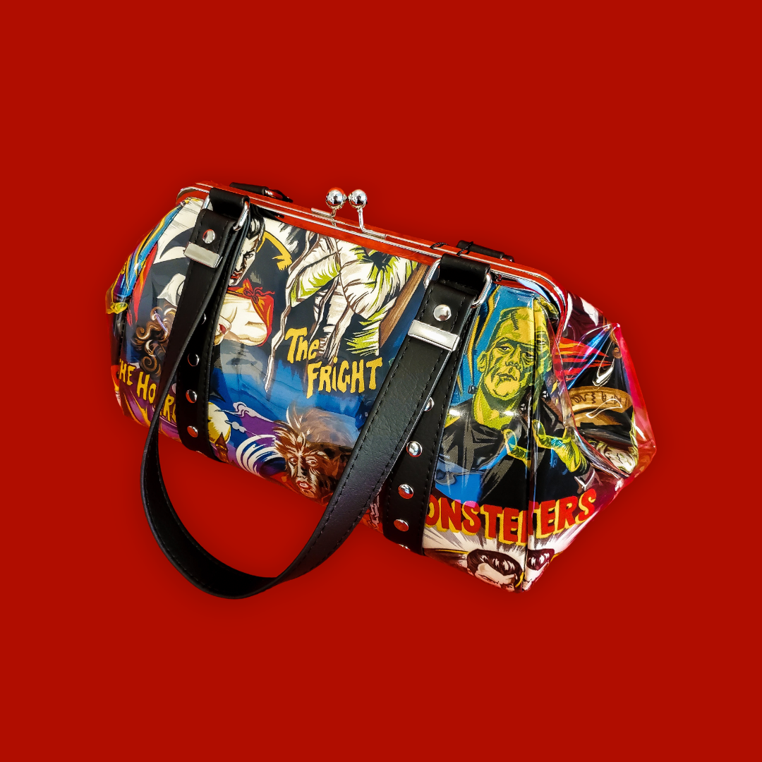 Be the envy of the daring and fashionable with the Midnight Monster Movie Handbag. She's the perfect package of spooky sophistication, with her brightly colored, hunky-monster prints and matte black vegan leather – she’s a fierce accesssory for any modern maven of terror. Swish through the night in style with her double shoulder straps for extra comfort and convenience. Let the monster movies begin!