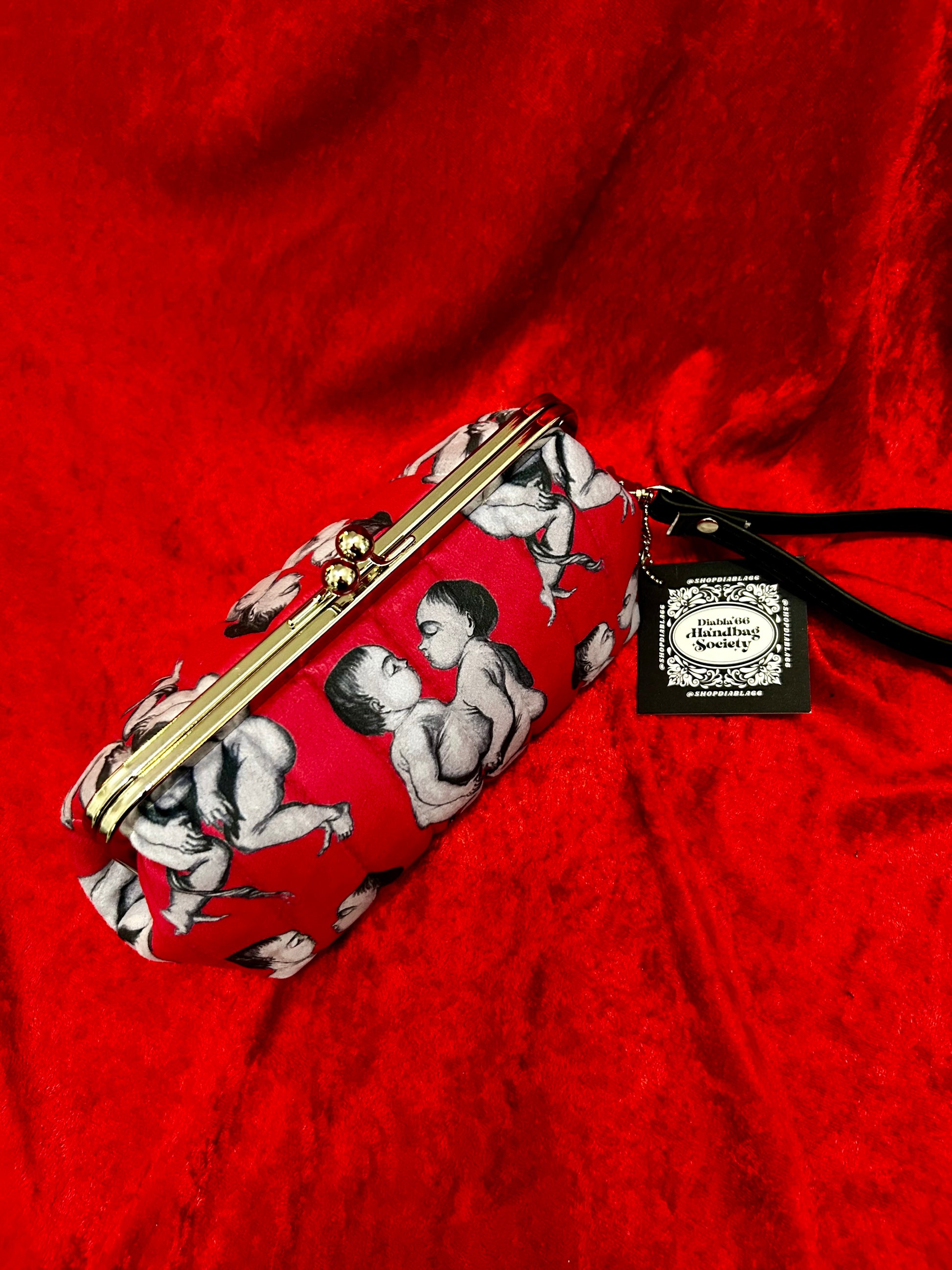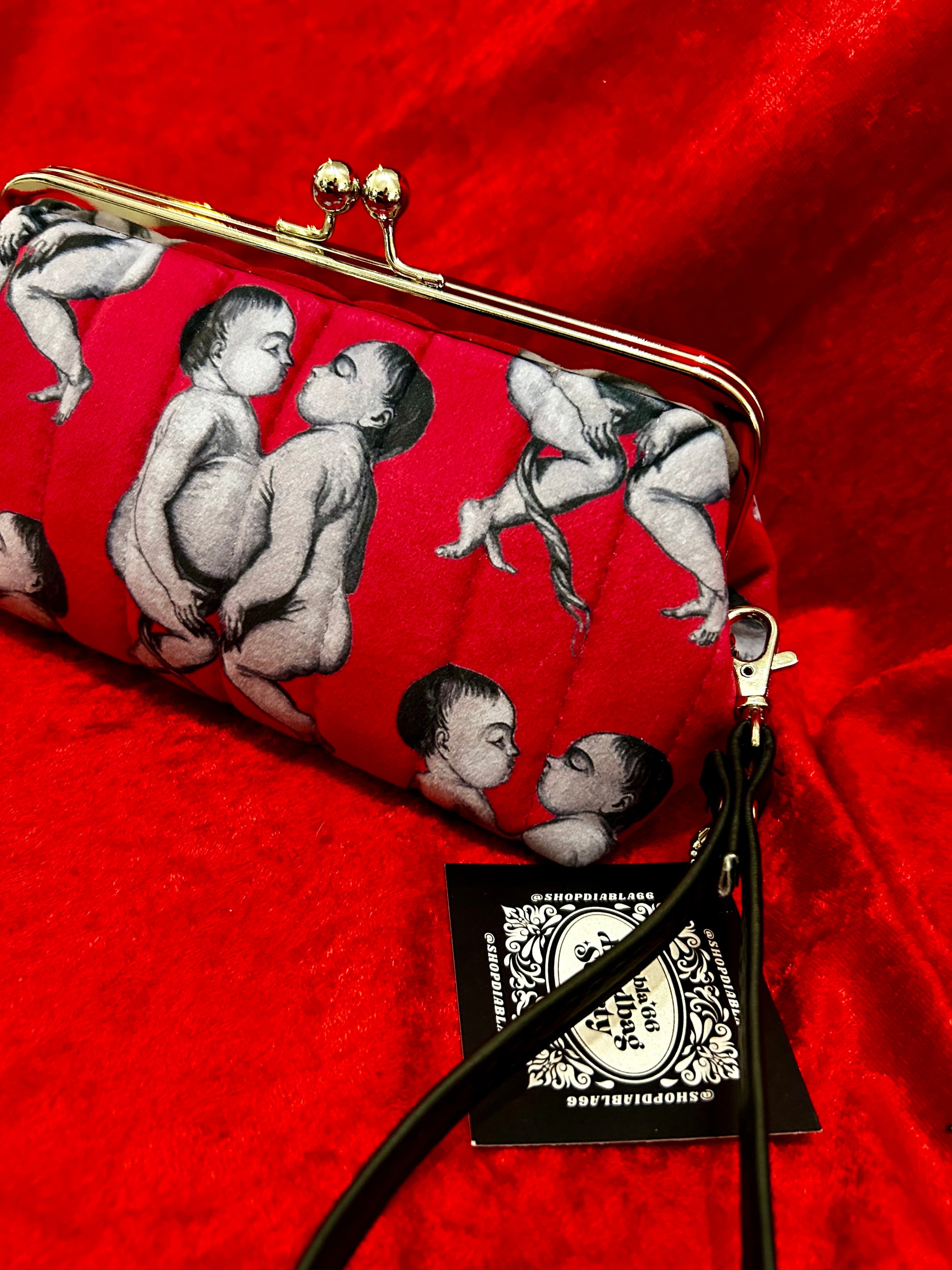 Get stuck on this pair of creepy kids! This creep-tacular sidekick is the most interesting bag you'll carry. Made of soft velvet material custom printed with vintage illustrations of conjoined twins, sleek black faux leather, silver-toned hardware and an adjustable shoulder strap for ghoulish glamour on-the-go! The included detachable crossbody strap makes it the perfect accessory for hands-free versatility.