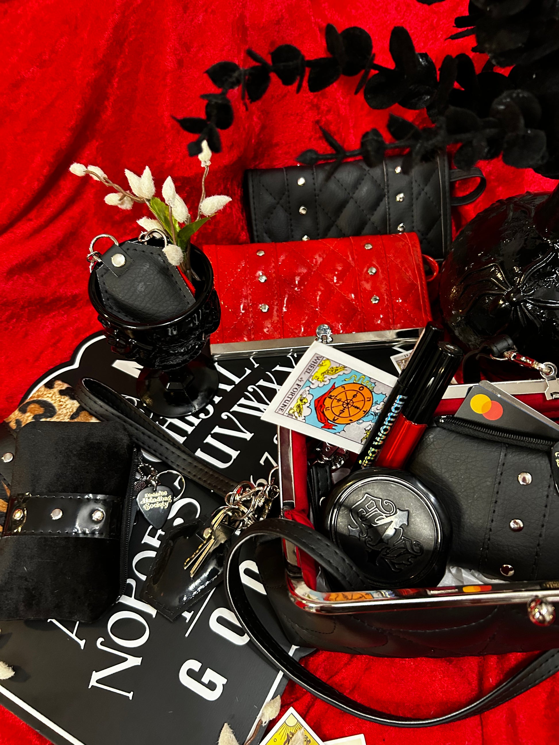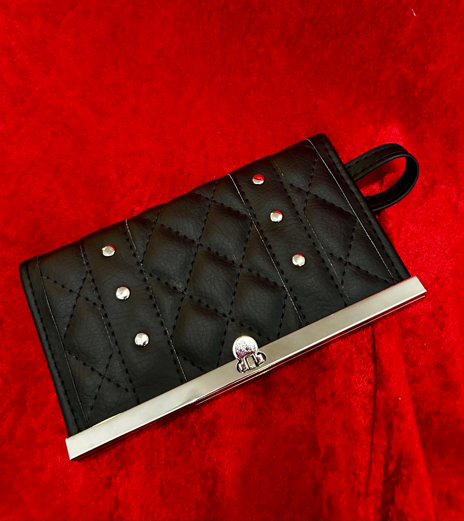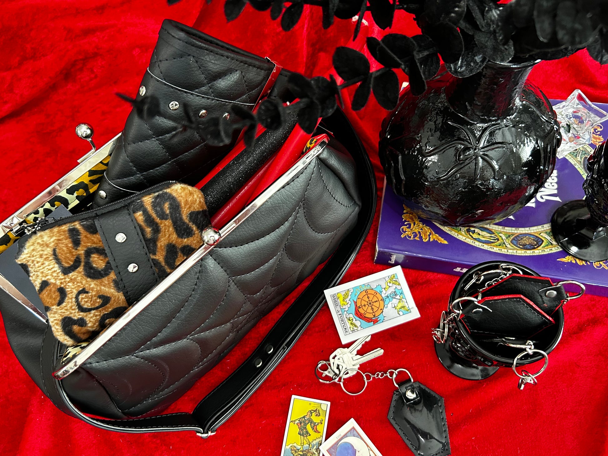 Stay one step ahead of the dead with our Necromancy Wallet. Crafted with luxe black matte vegan leather, sleek silver tone hardware, and your leopard lining, this bi-fold is perfect for keeping your essentials safe from any pesky ghouls. And 'cause you always gotta look good, the framed clasp closure and diamond top-stitching add that extra touch of sophistication and style. Now you too can join the club of the baddest of the bad-- grab one and put it in your Diabla 66 purse today!