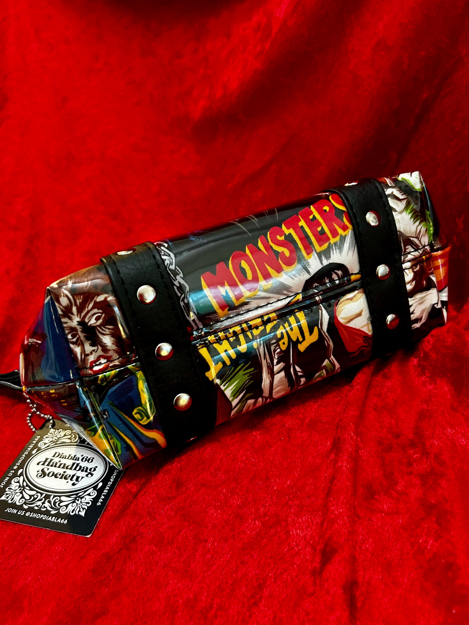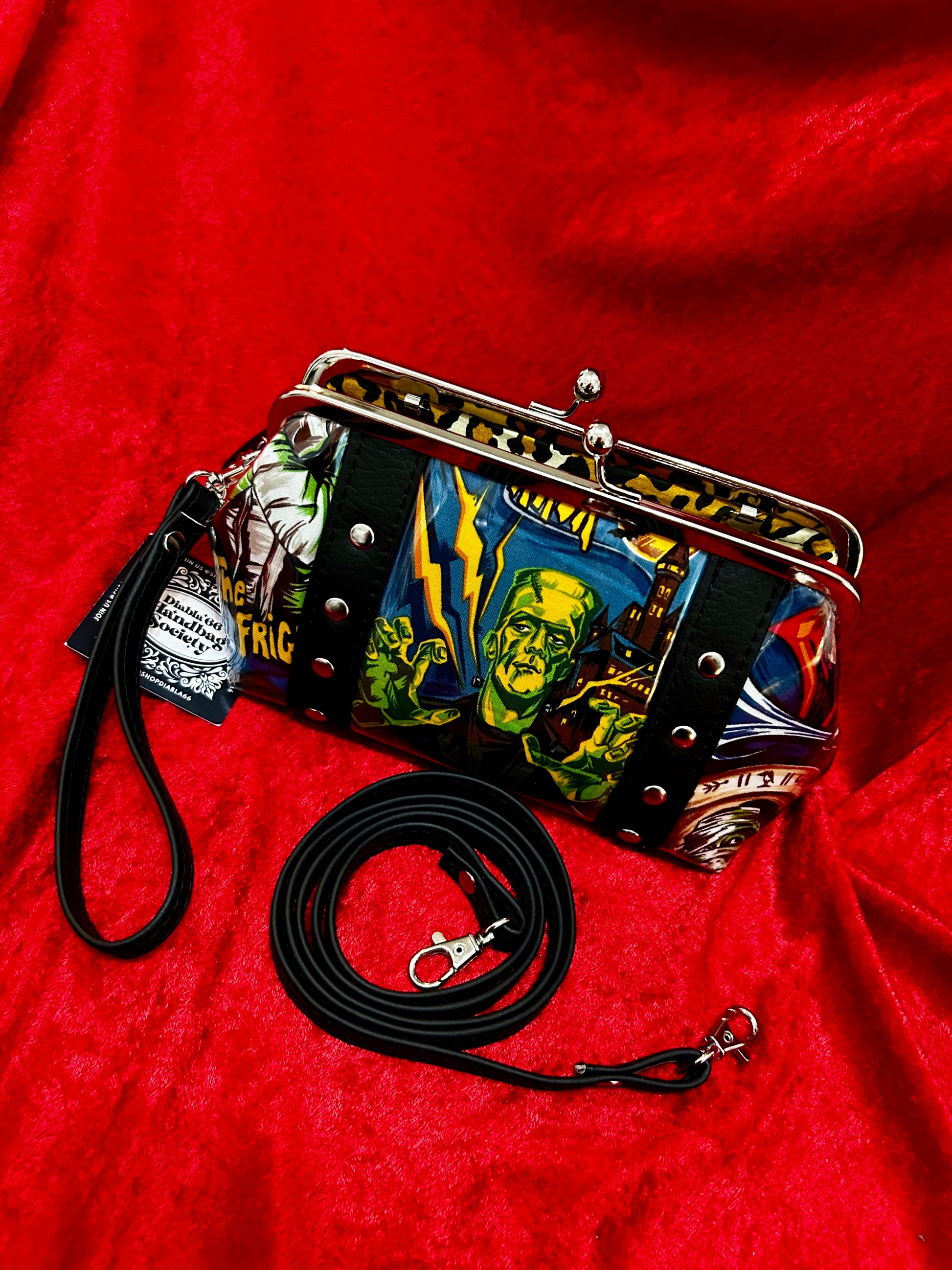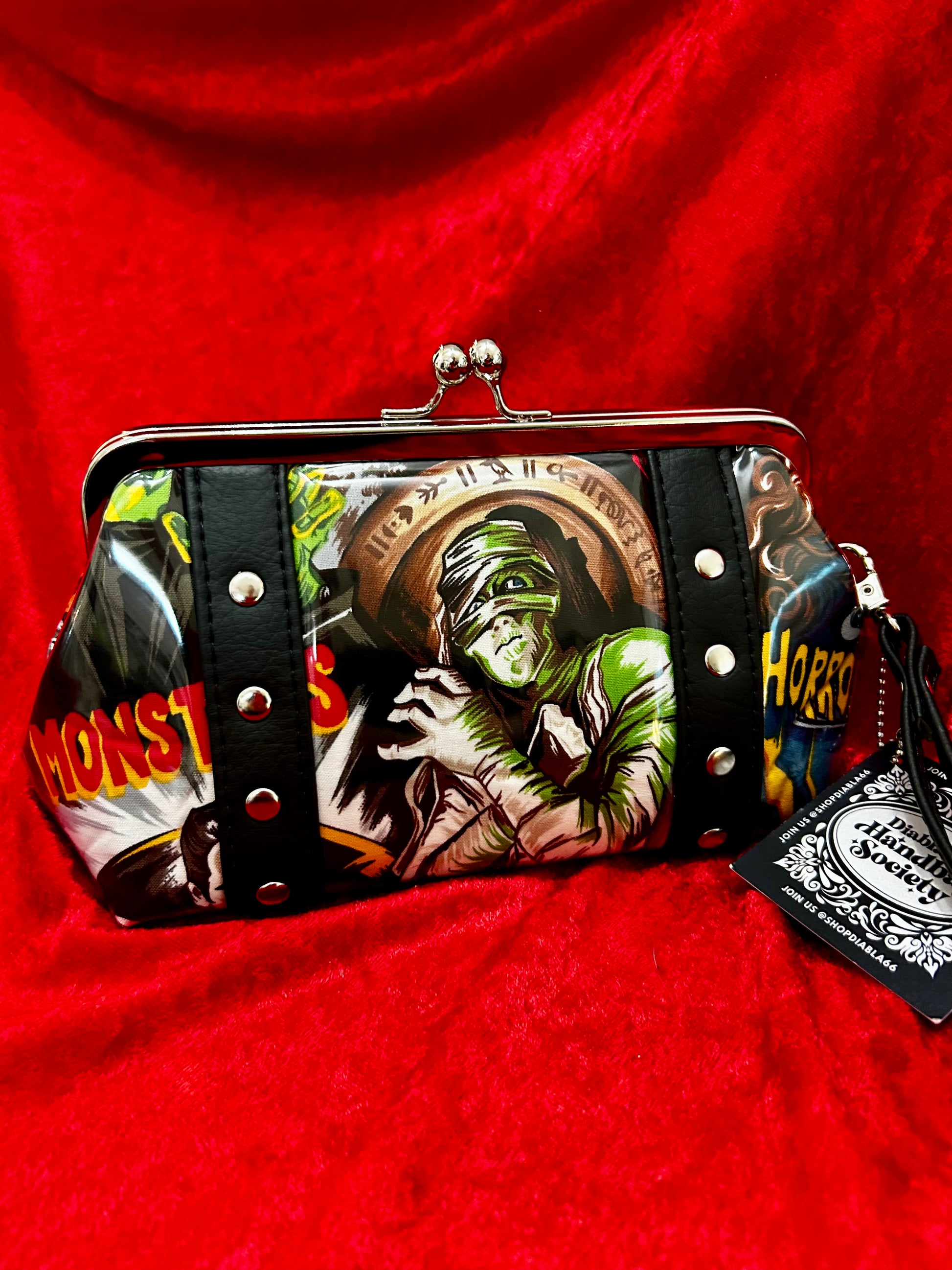 Terrorize the night in style with the Monster Movie clutch. Featuring classic horror characters under a glossy clear vinyl for easy cleaning and durability, and accented with studded hardware on black vegan leather for a strikingly spooky, yet sophisticated look. With a ball clasp closure, detachable wrist strap and an inside zipper pocket, this clutch is as practical as it is fearfully fashionable. Campy leopard lining and a detachable crossbody strap makes it the perfect accessory for horror honeys who love hands-free versatility.