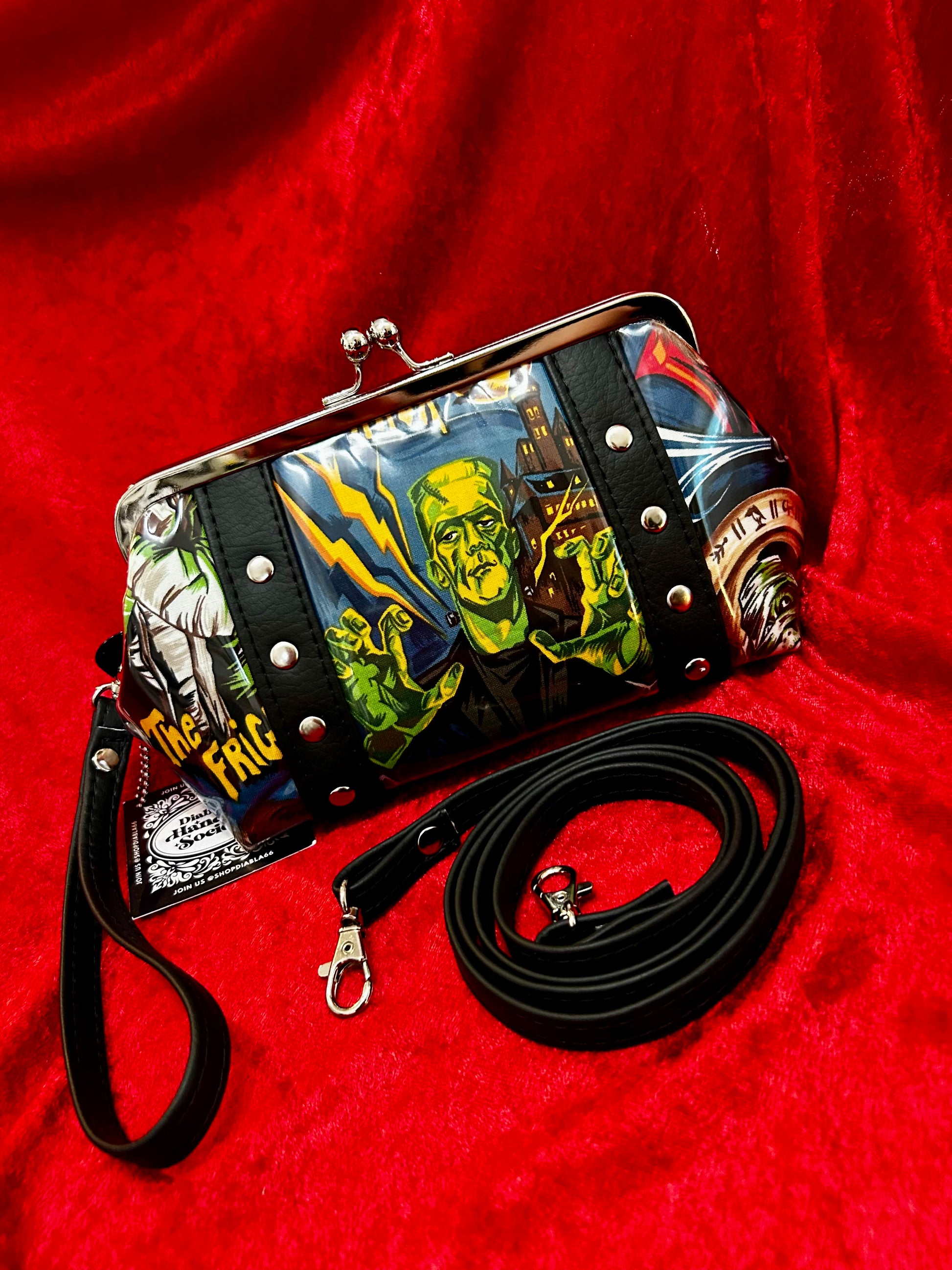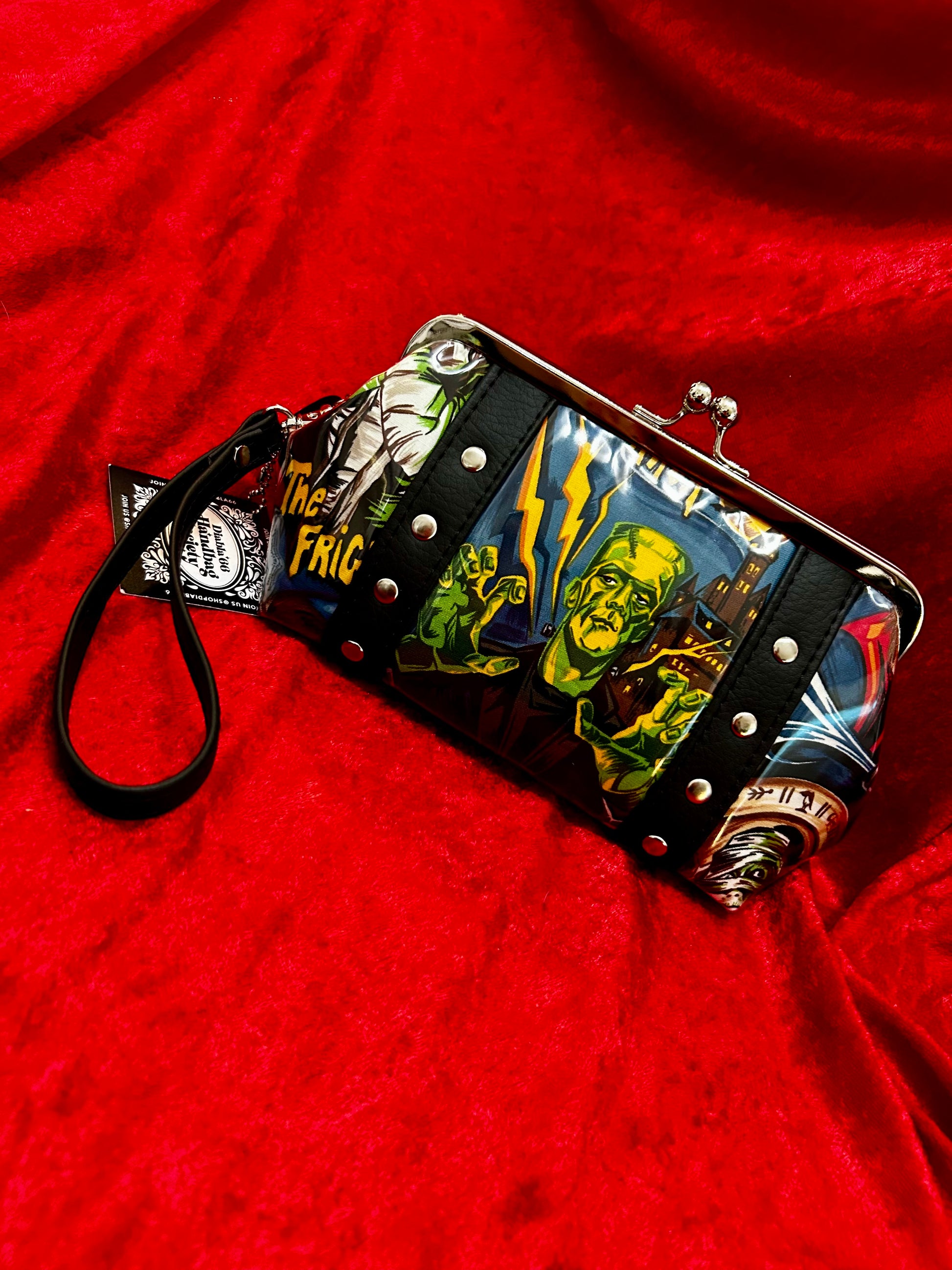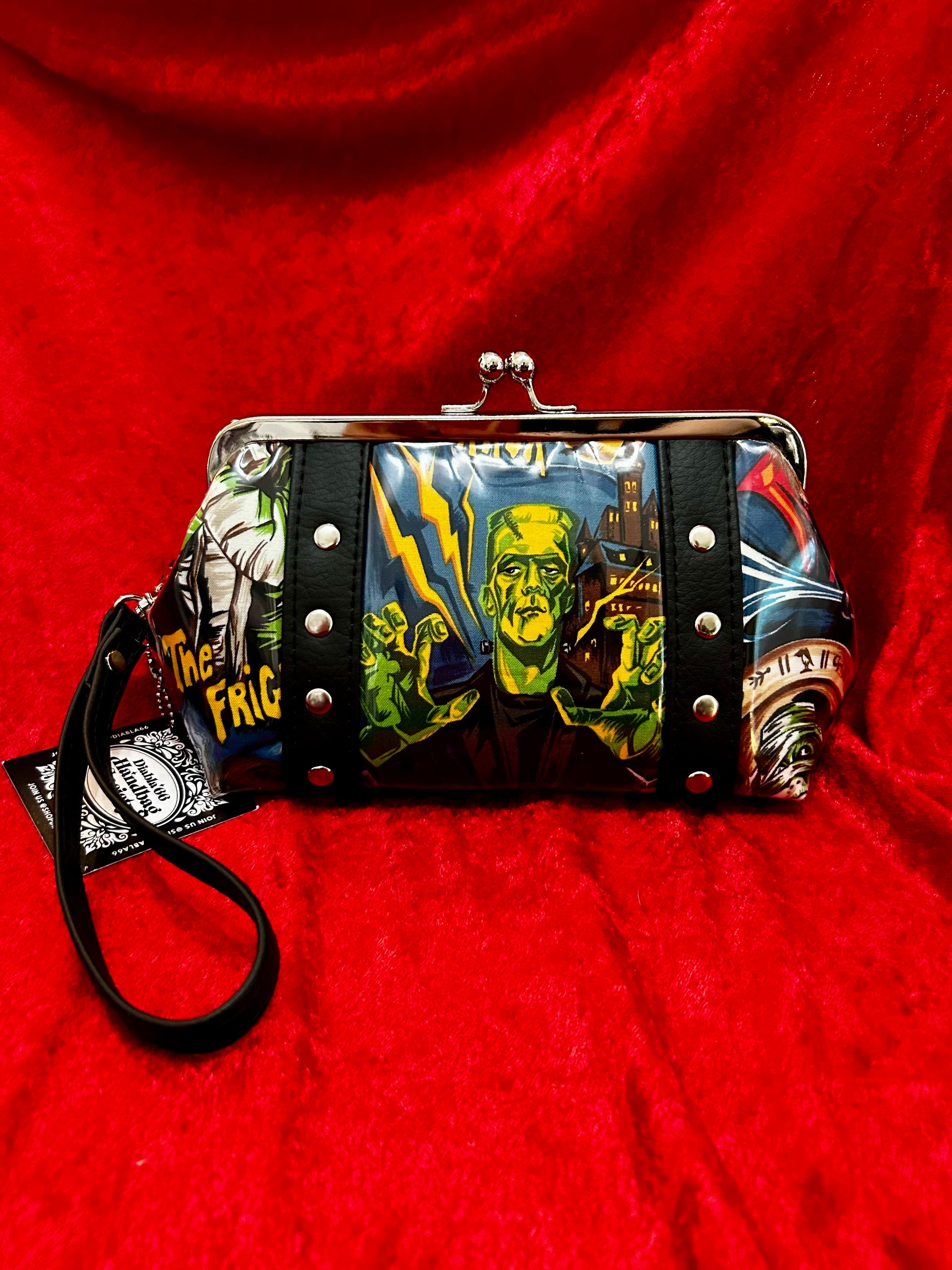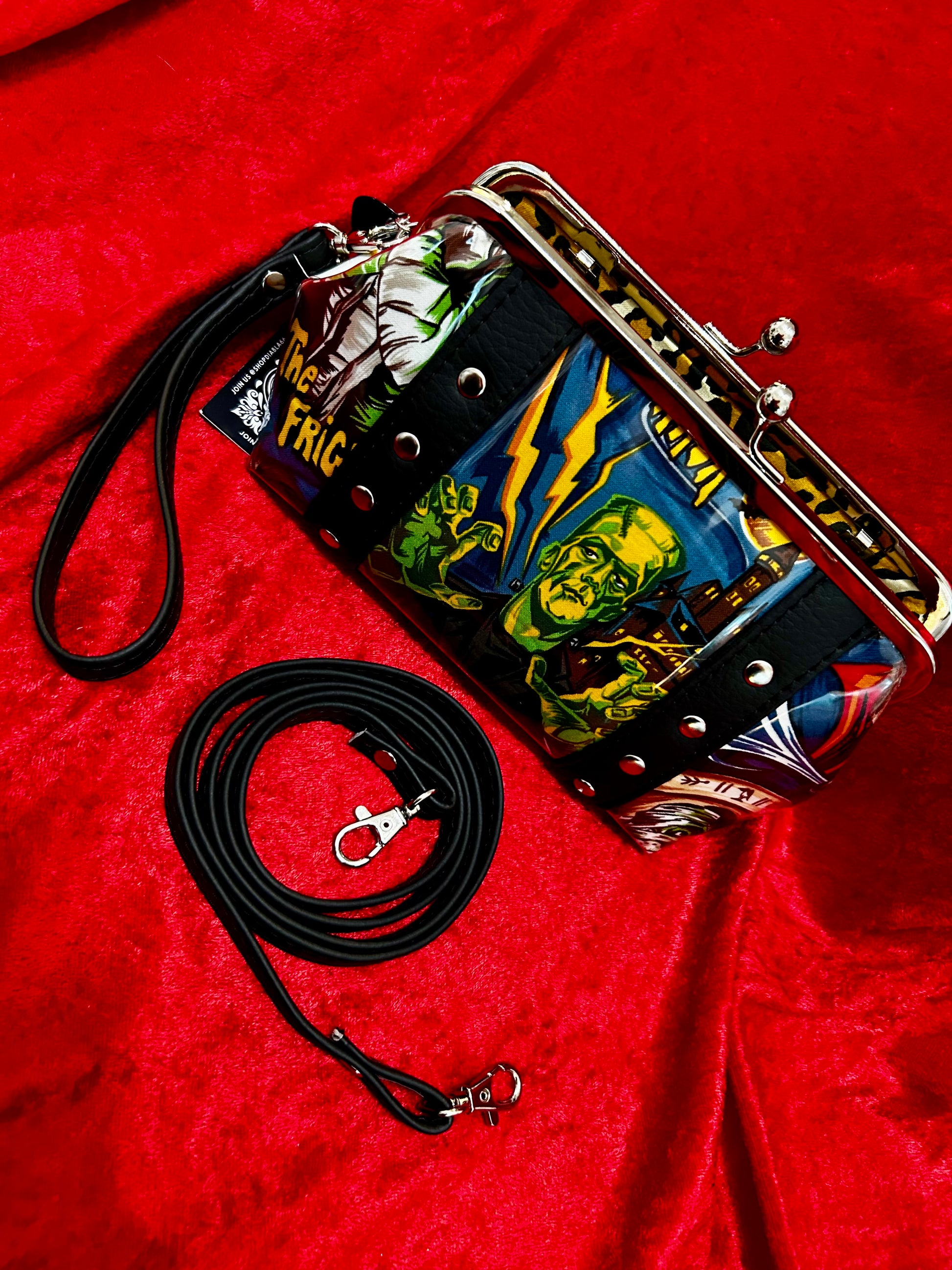 Terrorize the night in style with the Monster Movie clutch. Featuring classic horror characters under a glossy clear vinyl for easy cleaning and durability, and accented with studded hardware on black vegan leather for a strikingly spooky, yet sophisticated look. With a ball clasp closure, detachable wrist strap and an inside zipper pocket, this clutch is as practical as it is fearfully fashionable. Campy leopard lining and a detachable crossbody strap makes it the perfect accessory for horror honeys who love hands-free versatility.