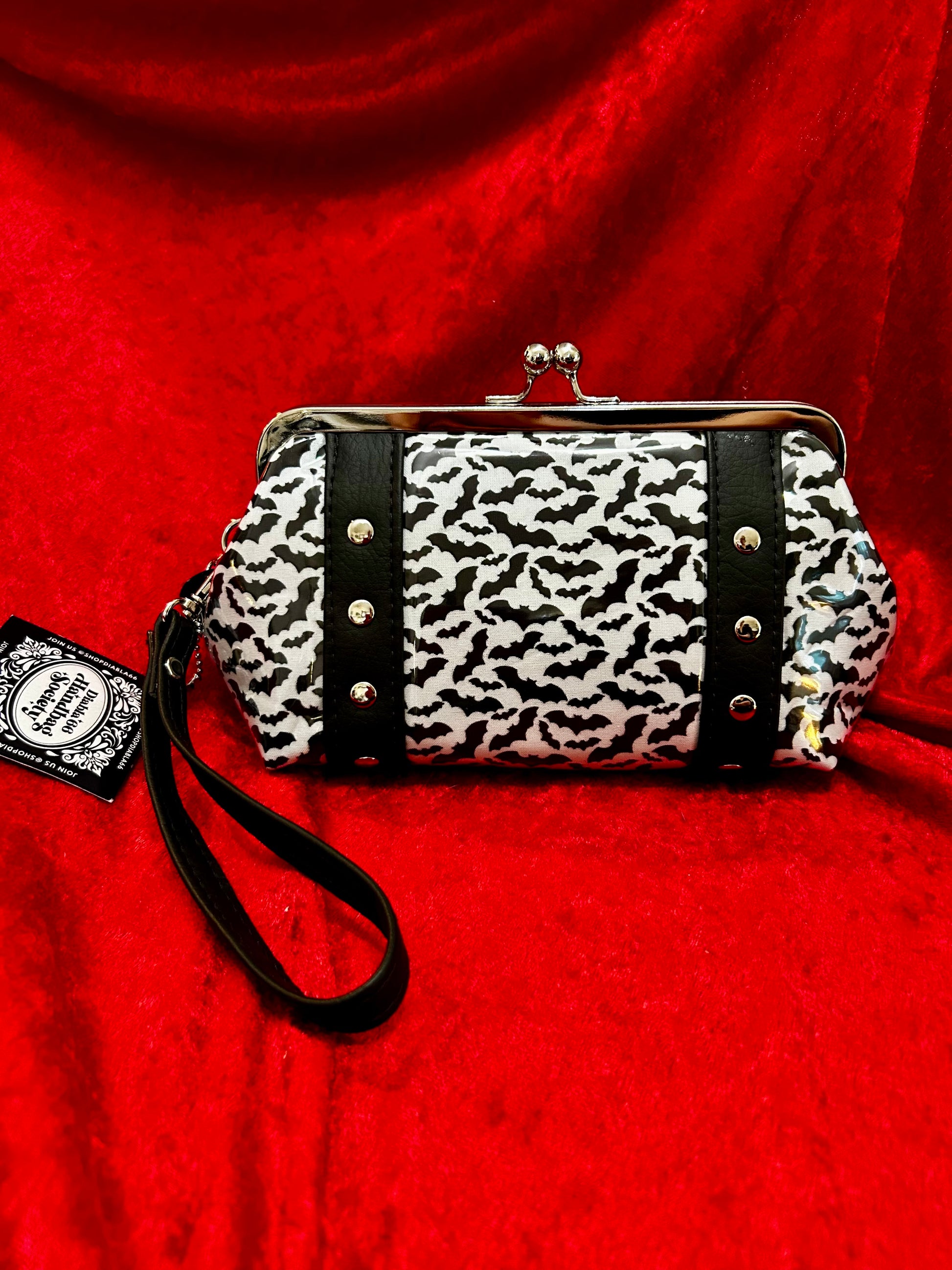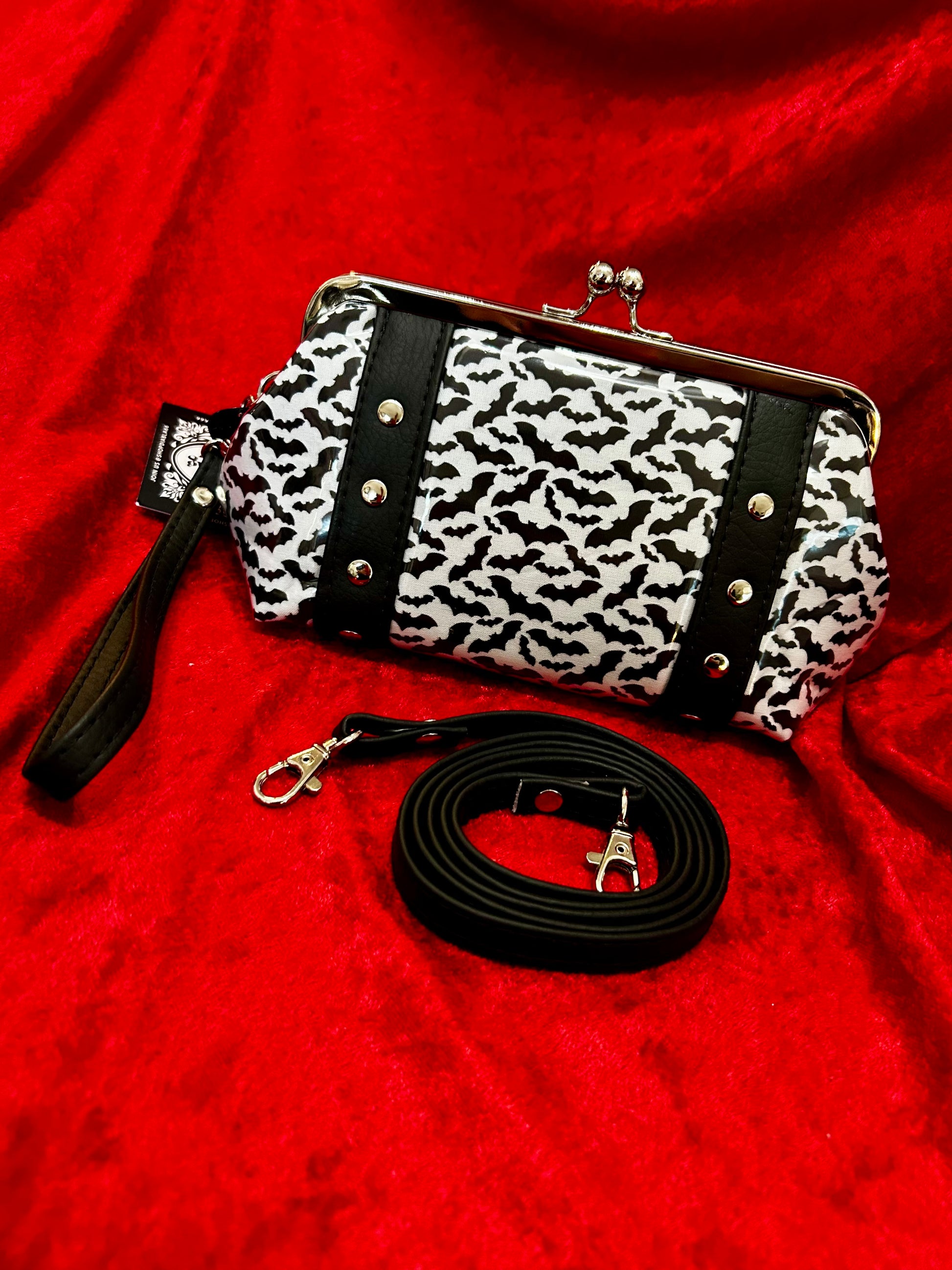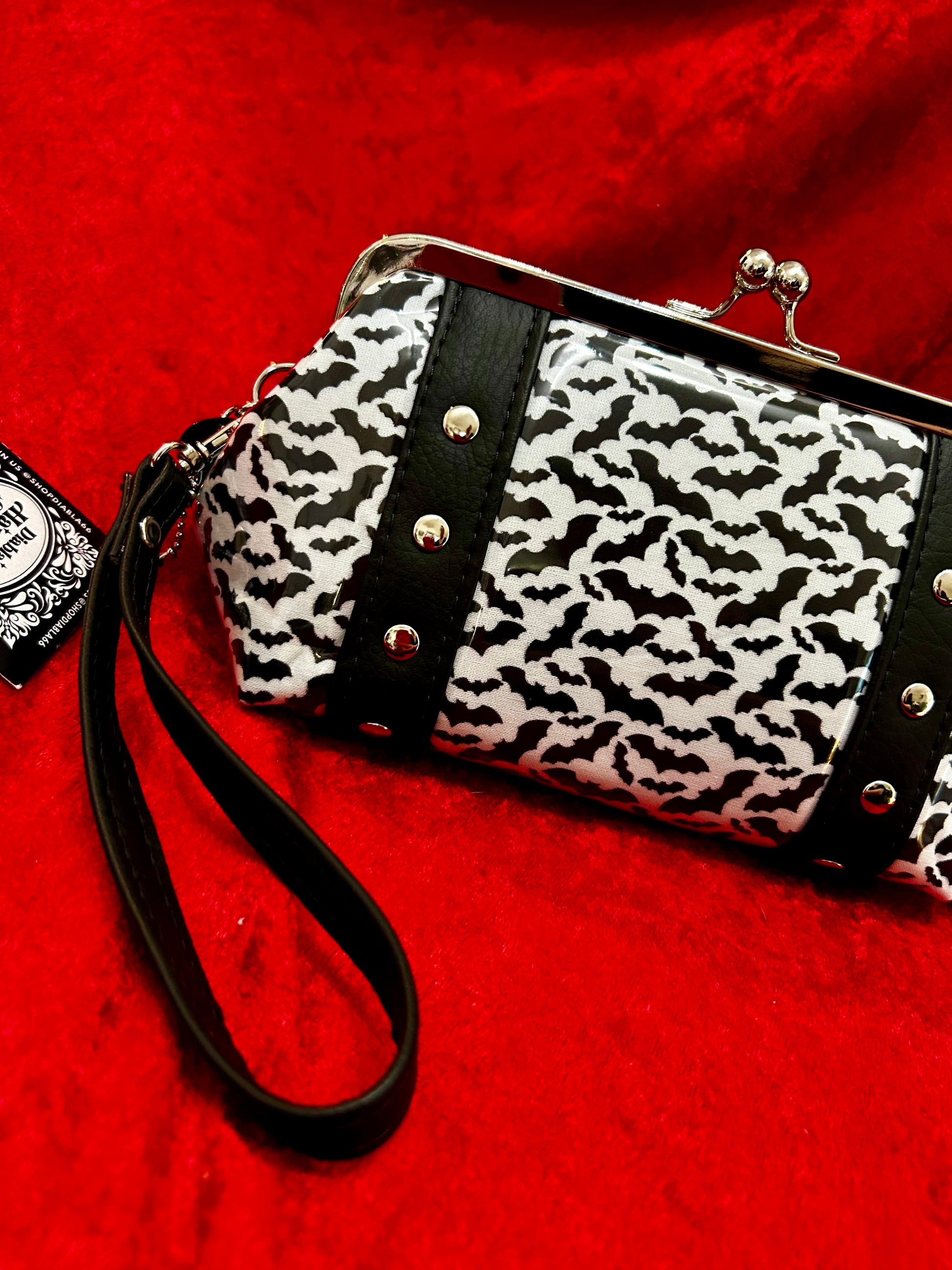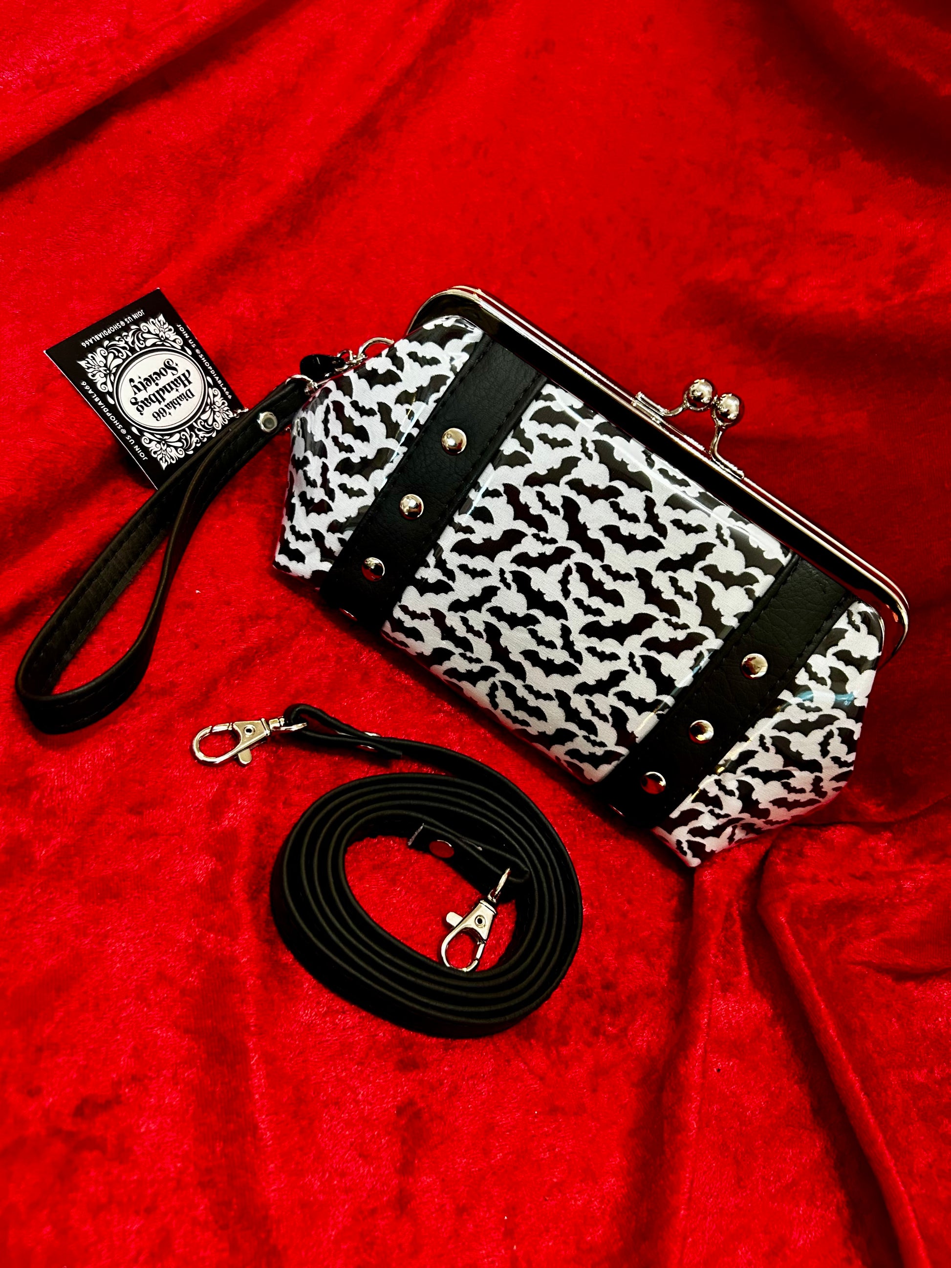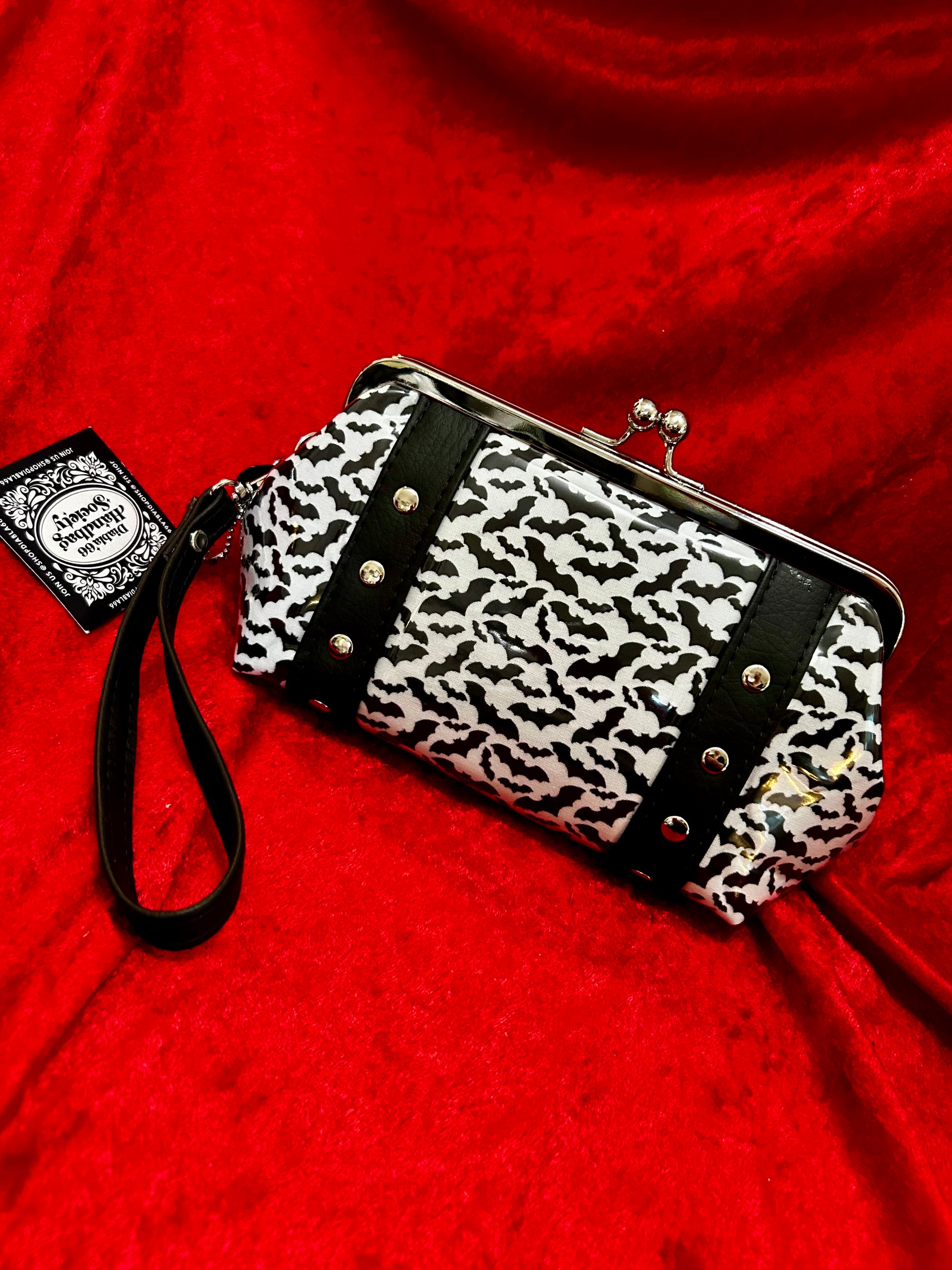 Set the night a-flutter with the Batty Bettie clutch bag! This spook-tacular sidekick has it all: white fabric with black bats, sleek black faux leather, silver-toned hardware and a detachable wrist strap to keep your ghoulish glamour on-the-go! Plus, with an 8 inch kisslock frame, inner zipper pocket and clear vinyl overlay, it's as tough as it is stylish. So, rock your own 'bat-itude' and up your ghoulish glamour with this statement piece.