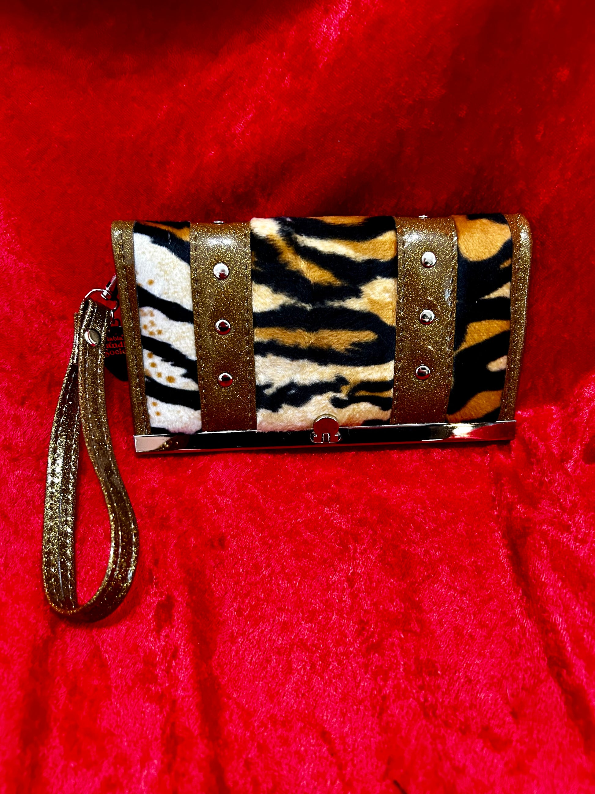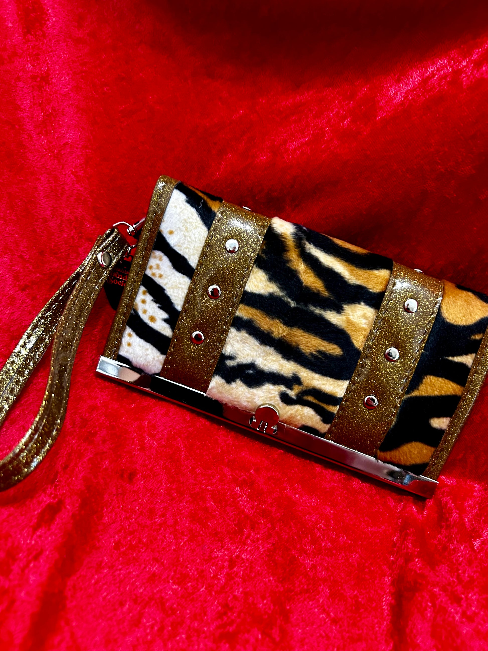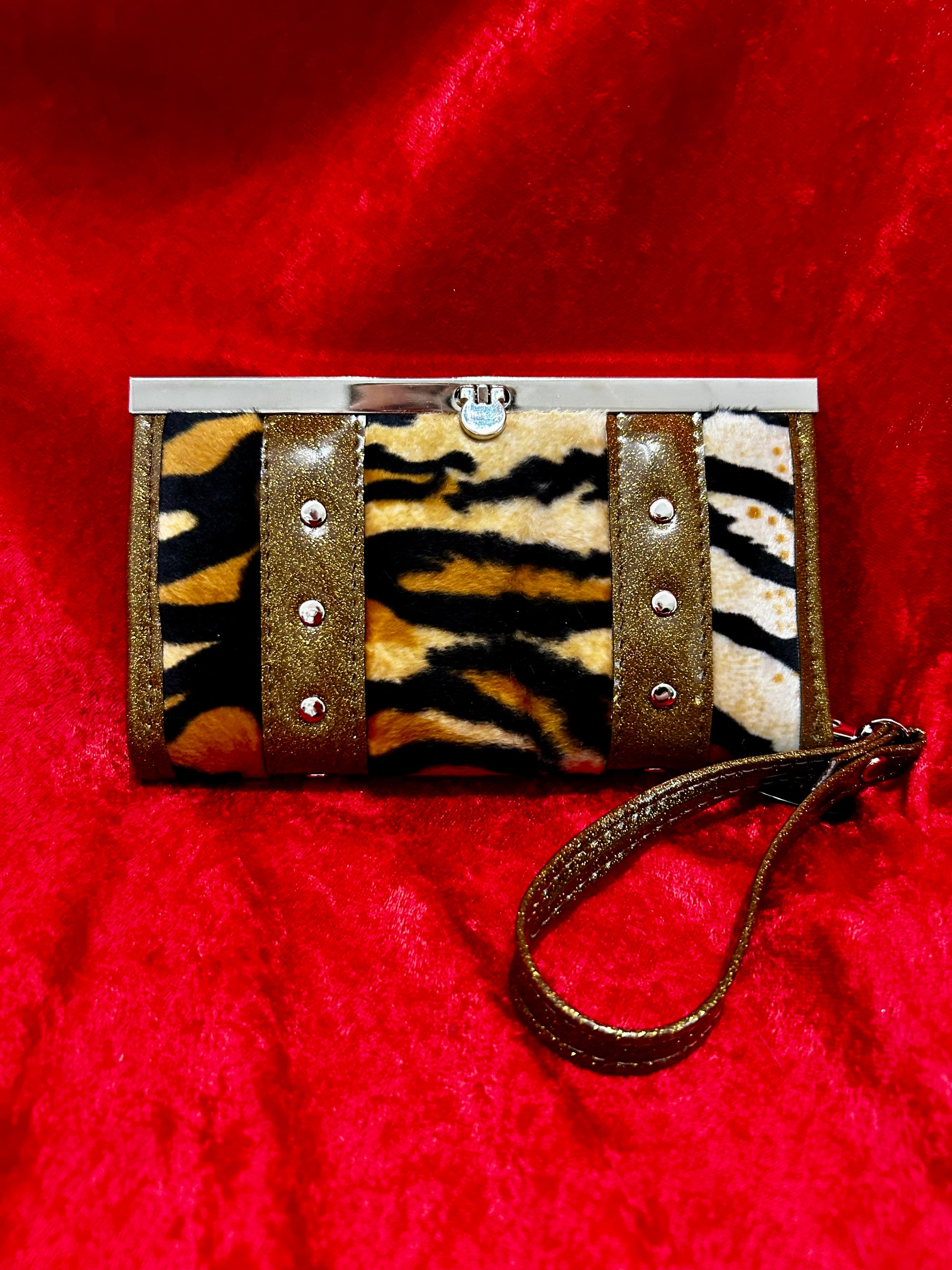 Tame your wardrobe with our Hell Kitten Wallet - This purr-fect accessory is crafted with luxe tiger faux fur and glittering gold sparkle for a fierce look, and a frame sleek clasp closure to keep claws off your cash. With enough card slots and pockets to keep your Diabla 66 purse full of the essentials, it's purr-fect for the baddest babes! (And for anyone who wants to unleash their inner sex kitten.)